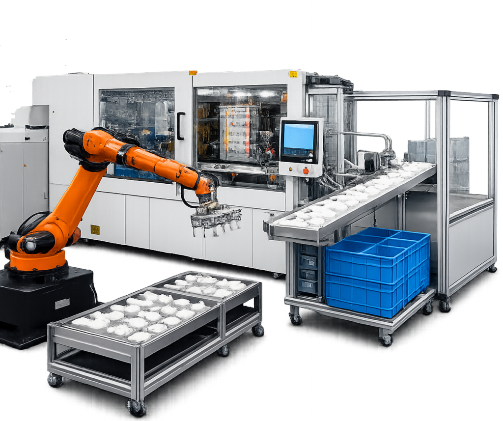 Dank dieser Expertise im eigenen Haus sind wir in der Lage, maßgeschneiderte Automatisierungslösungen zu entwickeln, zu planen und selbst zu realisieren. Von der Entnahme von Spritzgussteilen über Montage- und Prüfstationen bis hin zu kompletten Handlings- und Intralogistiksystemen – unsere Lösungen sind darauf ausgelegt, Produktionsprozesse effizienter, stabiler und wirtschaftlicher zu gestalten.